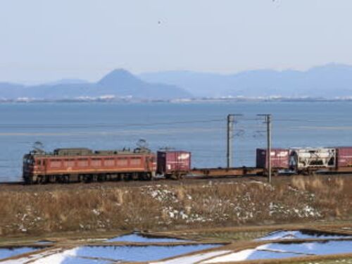 結果的にこれが見納めになった湖西線を走るEF81。 いつもの志賀駅近くで琵琶湖、三上山を背景に最後の頑張りを見せてくれた。 田圃の畔には前夜の雪が少し残っている。 先日入手した2014年版の貨物時刻表によると、3月15日のダイヤ改正で湖西線を走る富山機…