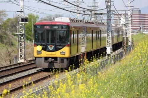 菜の花の咲く淀川堤防に沿って走る京阪電車。 ここは遠景はともかく、近景に住宅が写り込まない残り少ない区間だ。 良い天気が続きます。 天気が良いのに家に居ると何か勿体ない気がして、前から一度行こうと思っていた淀〜中書島間の京阪電車の撮影に行って…