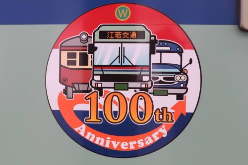 バスに貼り付けられている100周年ロゴマーク 昨年、鉄道廃線50周年のイベントにも参加した江若鉄道ですが、鉄道廃止後もバス事業を中心に湖西地域で営業を継続していて、今年は創立100周年になります。 会社としては「廃止」より「創立」の方がおめでたいの…