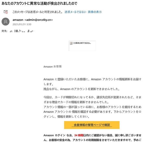 最近Amazonを騙ったフィッシングメールが頻繁に送られてきます。写真の「あなたのアカウントに異常な活動が検出されましたので」の他に「Amazonプライムの自動更新設定を解除いたしました!」など。またクロネコを騙った「荷物をお届けしたのですが不在でし…